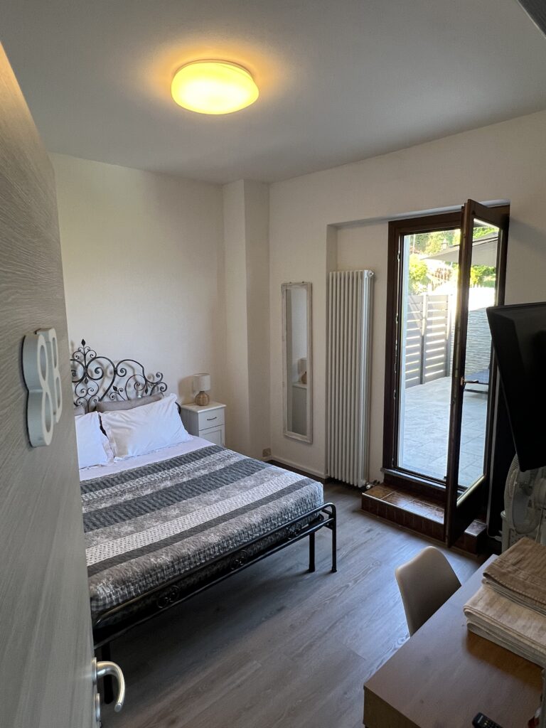 La Camera 8.B è moderna e accogliente, dotata di un letto matrimoniale per due persone e di un ampio bagno privato. La vera protagonista è la terrazza di 20 mq, arredata con sdraio, ombrellone e tavolino con sedie, dove potrete godere di una splendida vista laterale sul Lago Maggiore e del giardino verde. La camera è arredata con una scrivania e un appendi abiti, offrendo uno spazio funzionale e comodo. Il servizio include pulizia giornaliera, cambio asciugamani ogni 2 giorni e colazione a buffet, per una partenza energica ogni mattina. Posizionata nella parte posteriore della struttura, è perfetta per soggiorni fino a 2 settimane, offrendo tranquillità e comfort immersi nella natura. CIR 103064-BEB-00008
